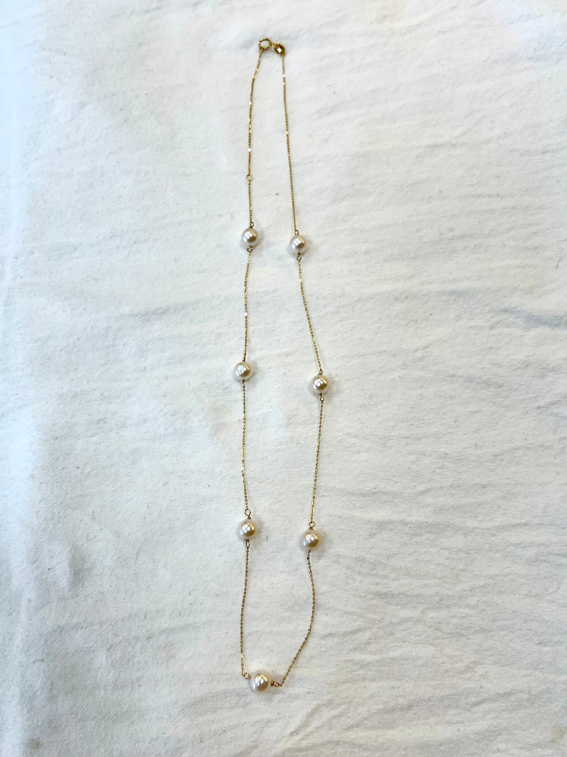 This custom hand wire wrap station freshwater pearl necklace in 10k yellow gold is 18 inches in length . Pearls are 6-6.5 mm .