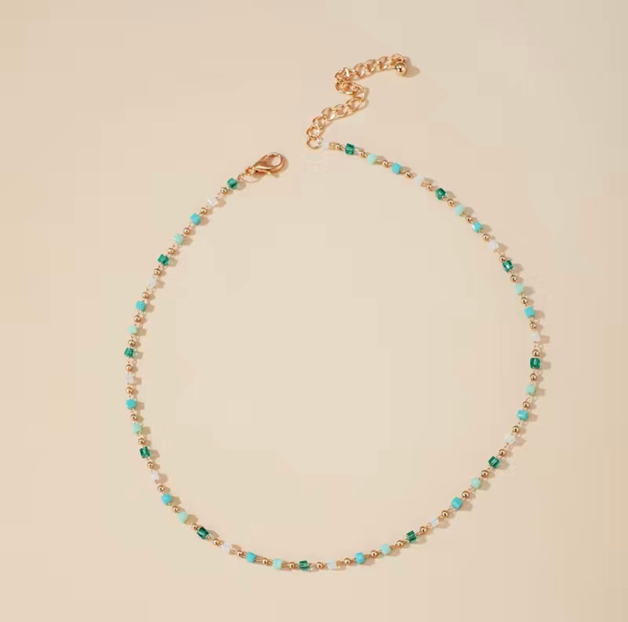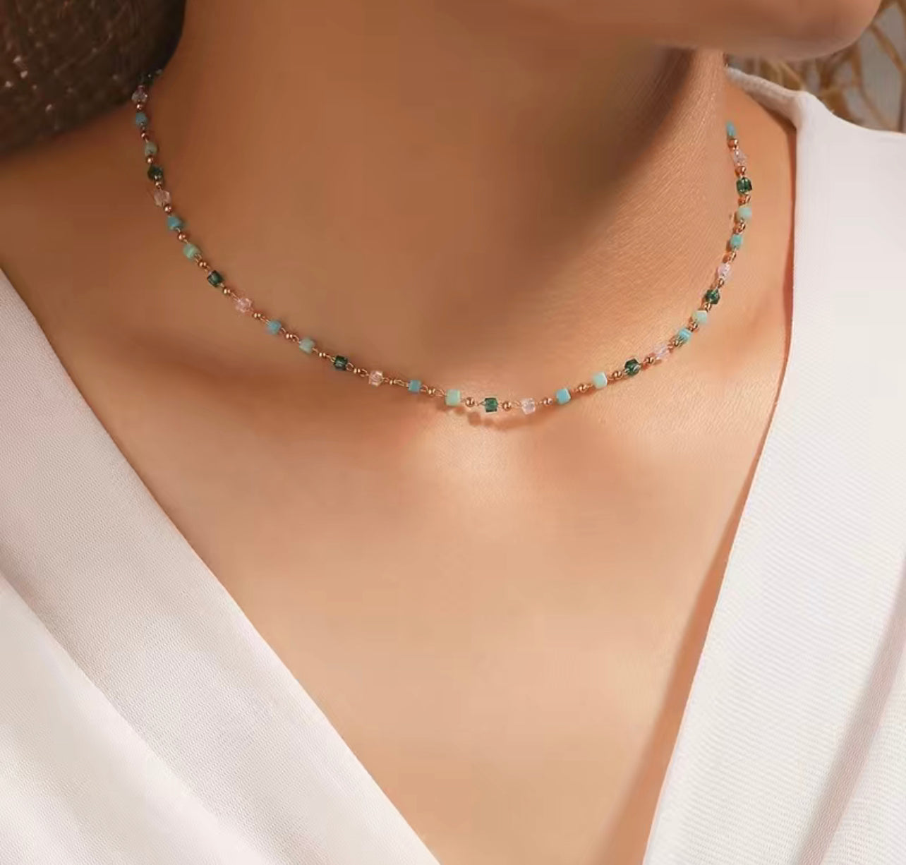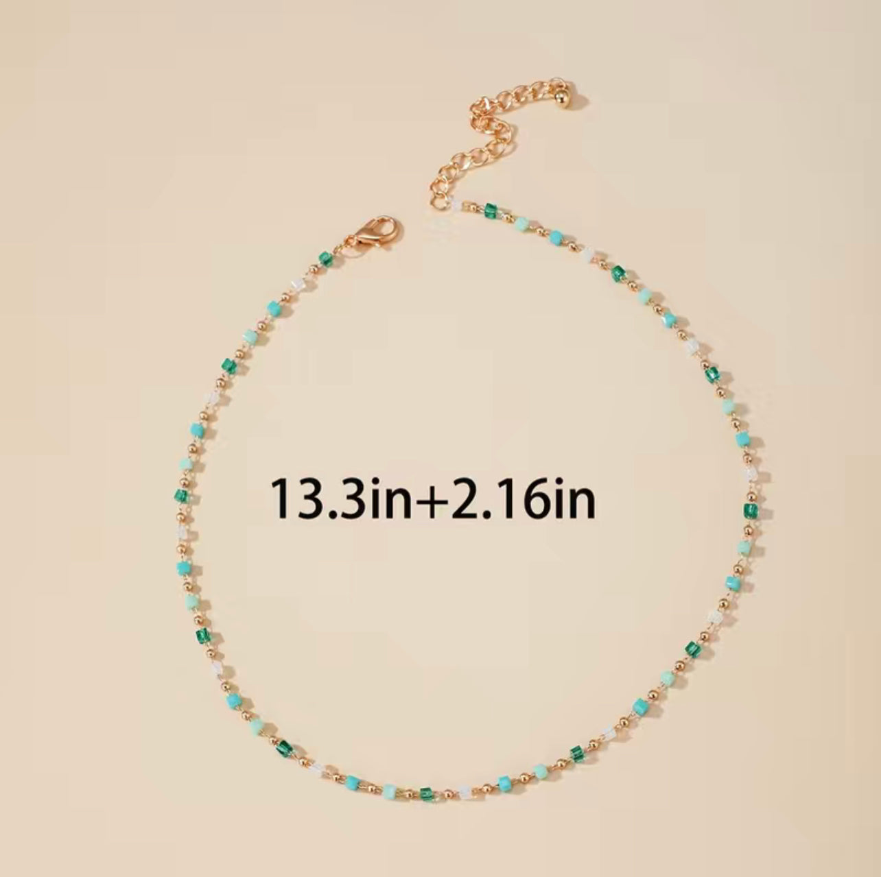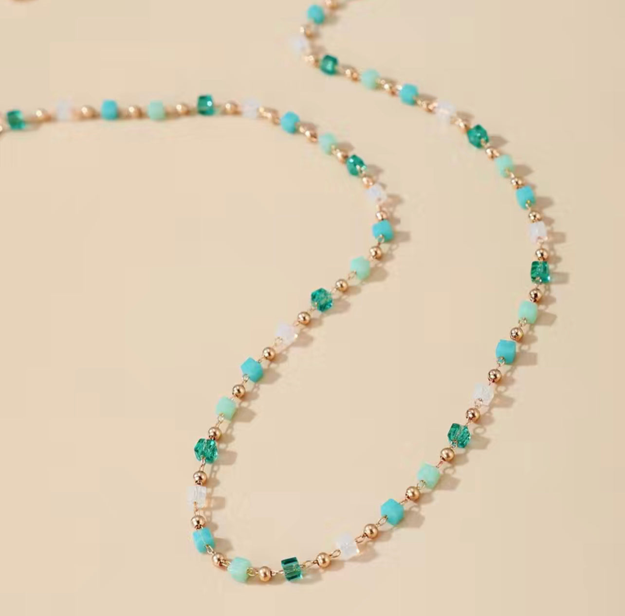 This hand made floating crystal neckkace contains green, light green , clear crystal and gold plated beads . It is 13.5-17” long