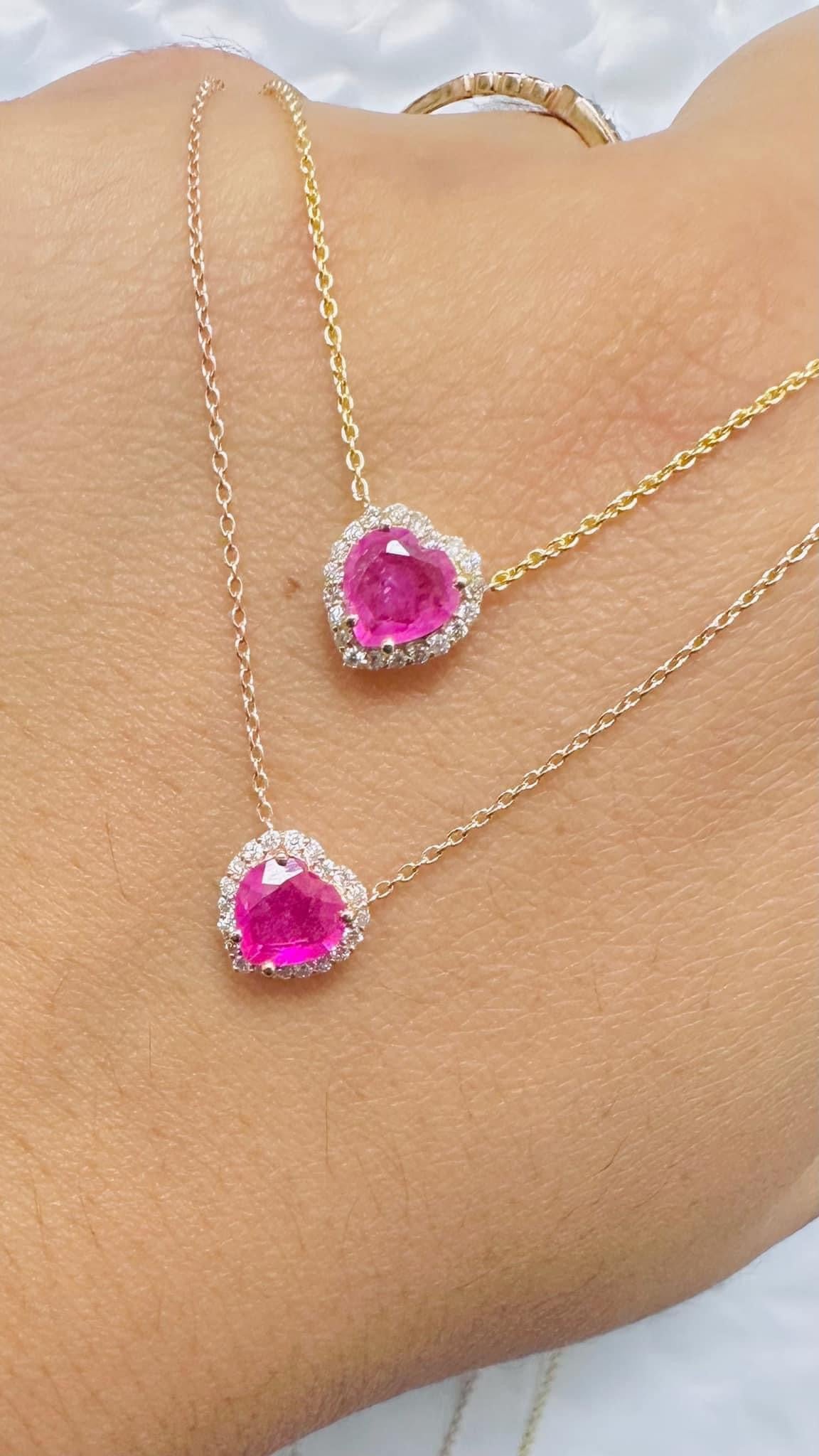 Pink sapphire heart with diamond pendant necklace in 14 k