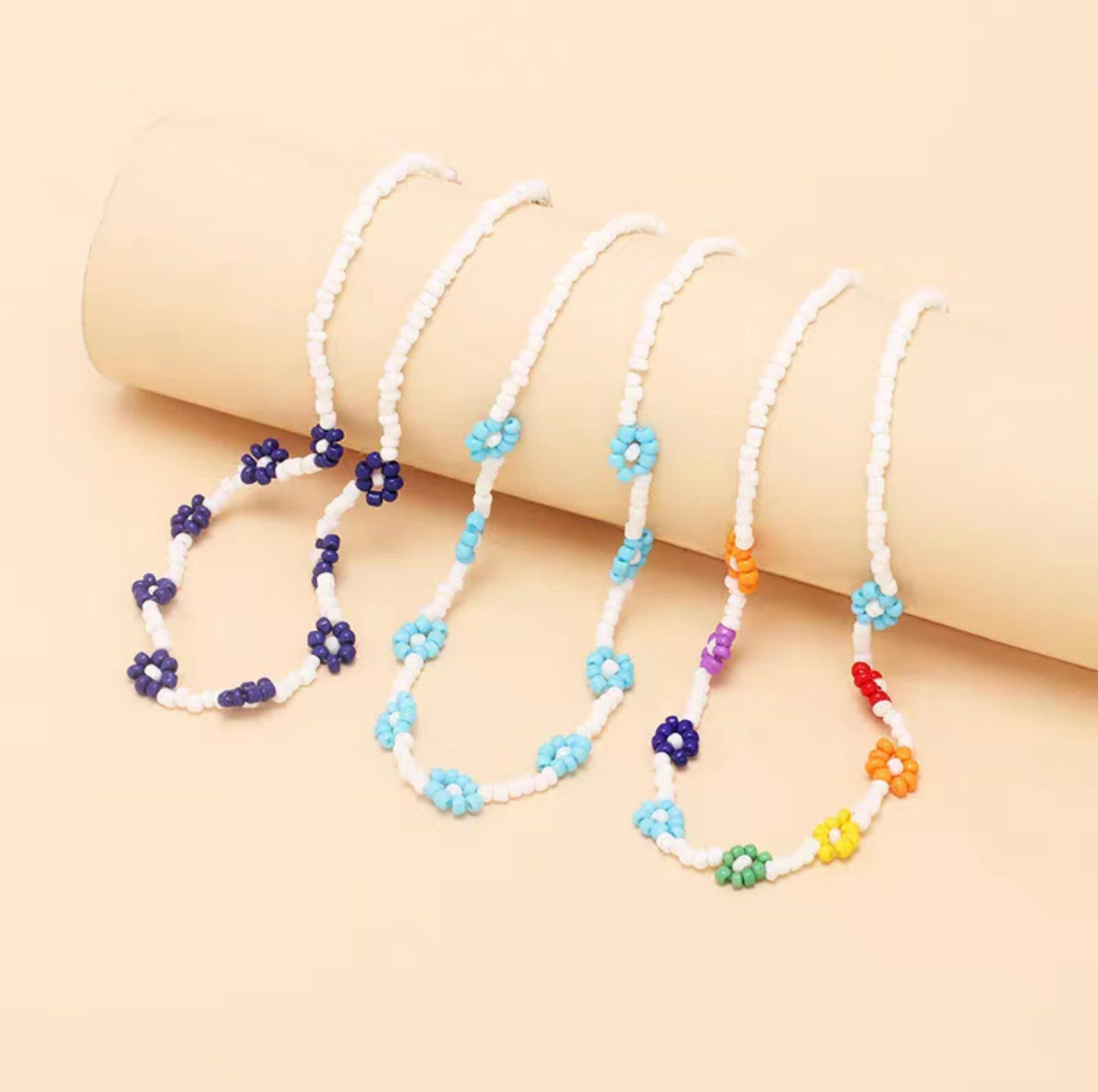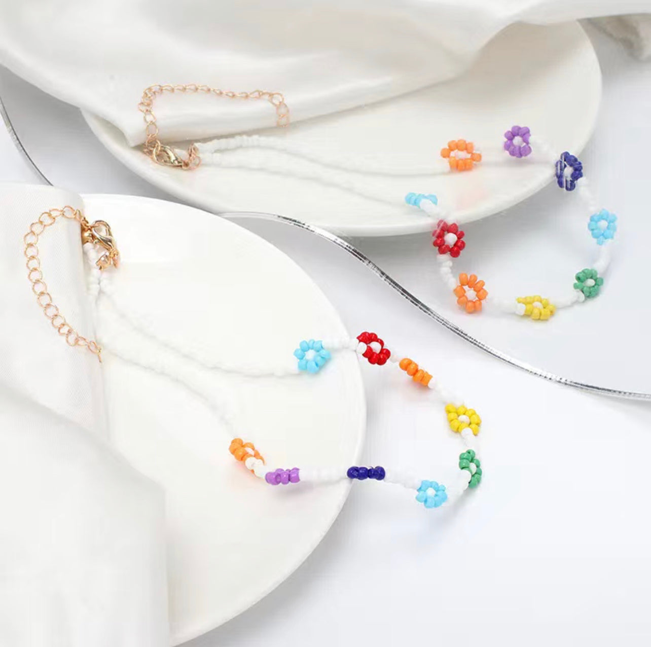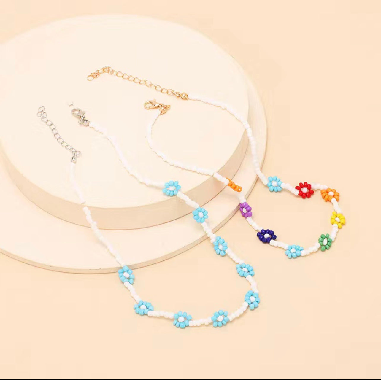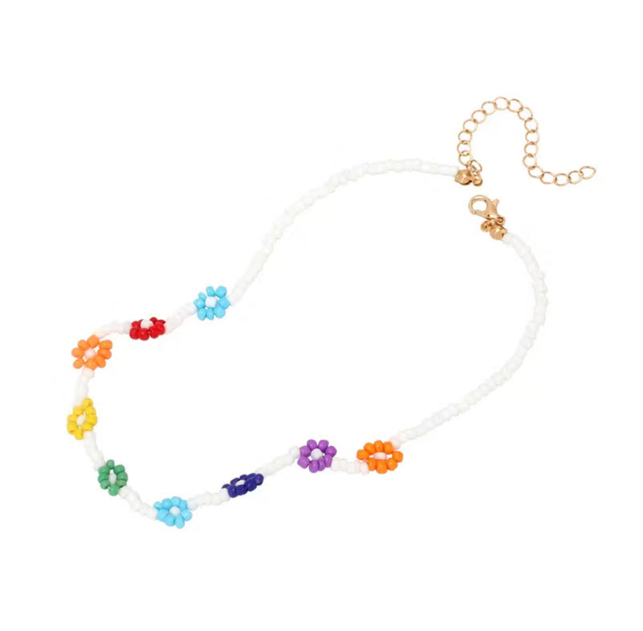 16-21” adjustable daisy seed bead necklace hand beaded. In multi color or rainbow color