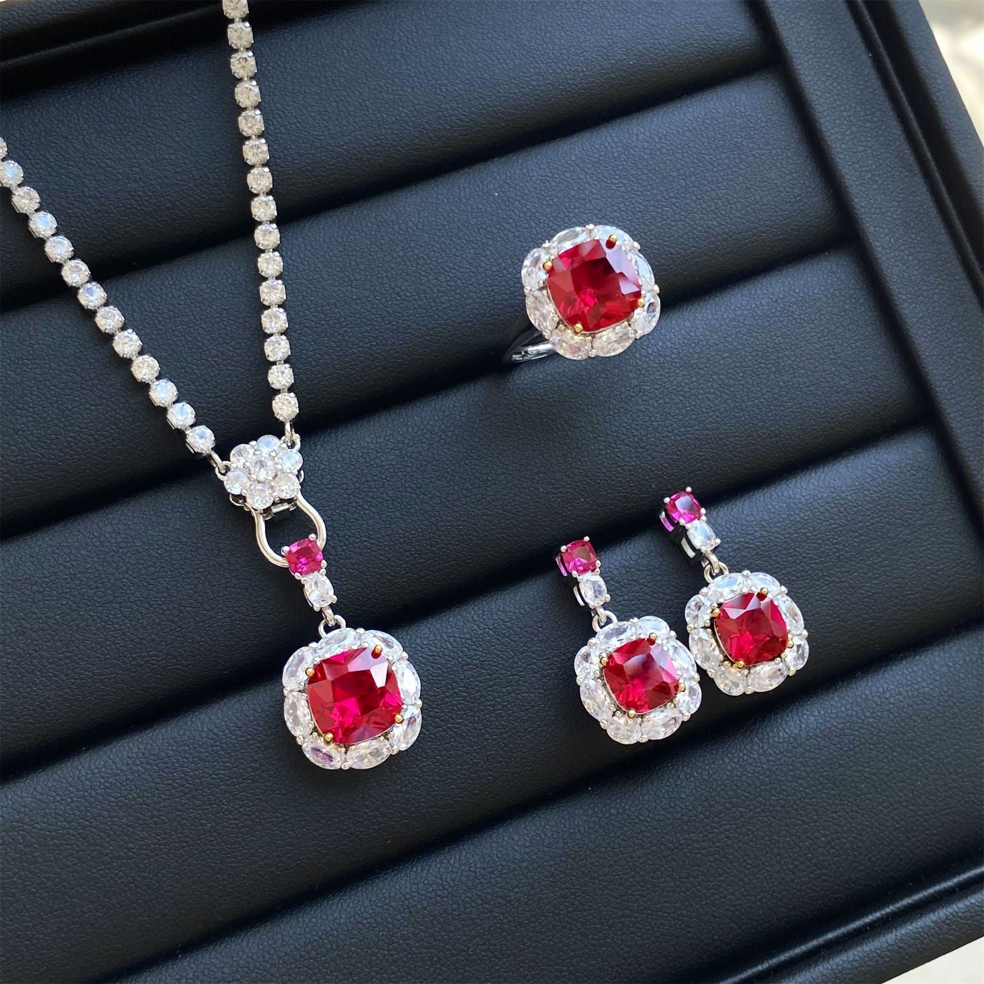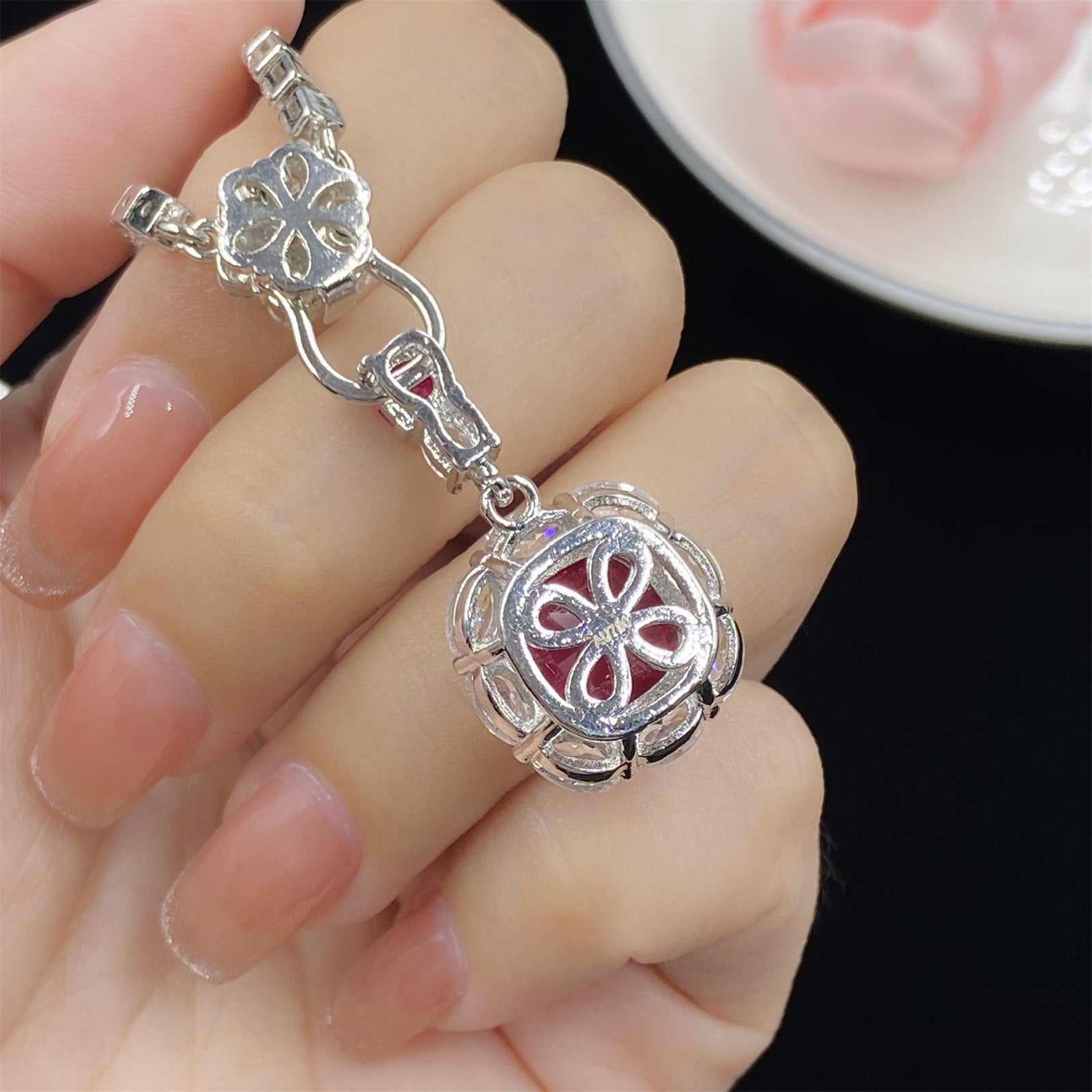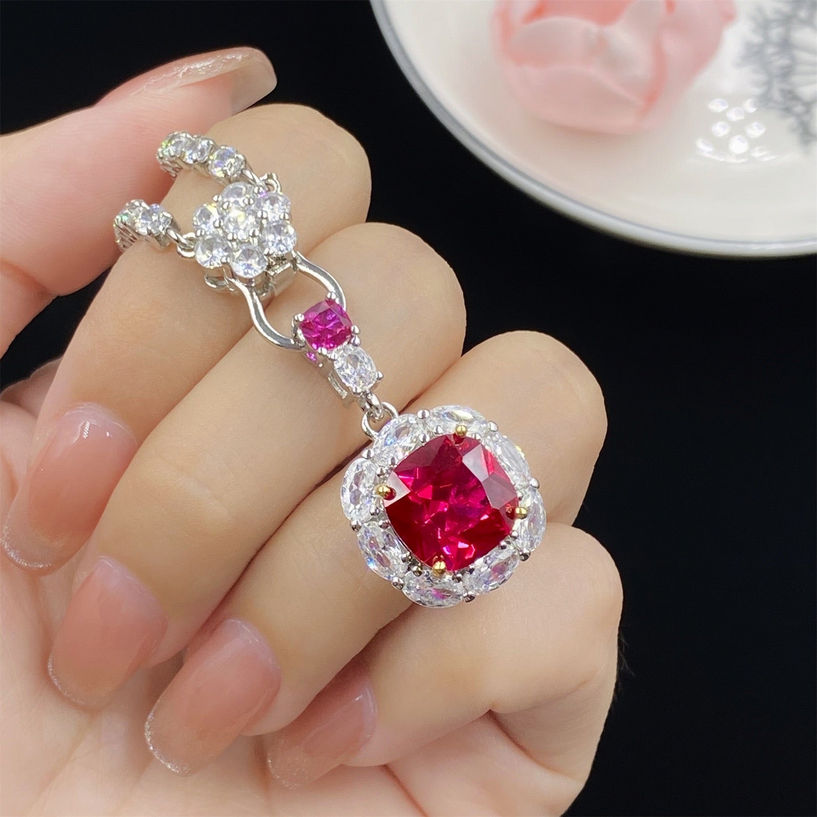 This 10 x 10 cushion cut synthetic Ruby cubic zirconia pendant measures about 1” in length . Chain are not included .