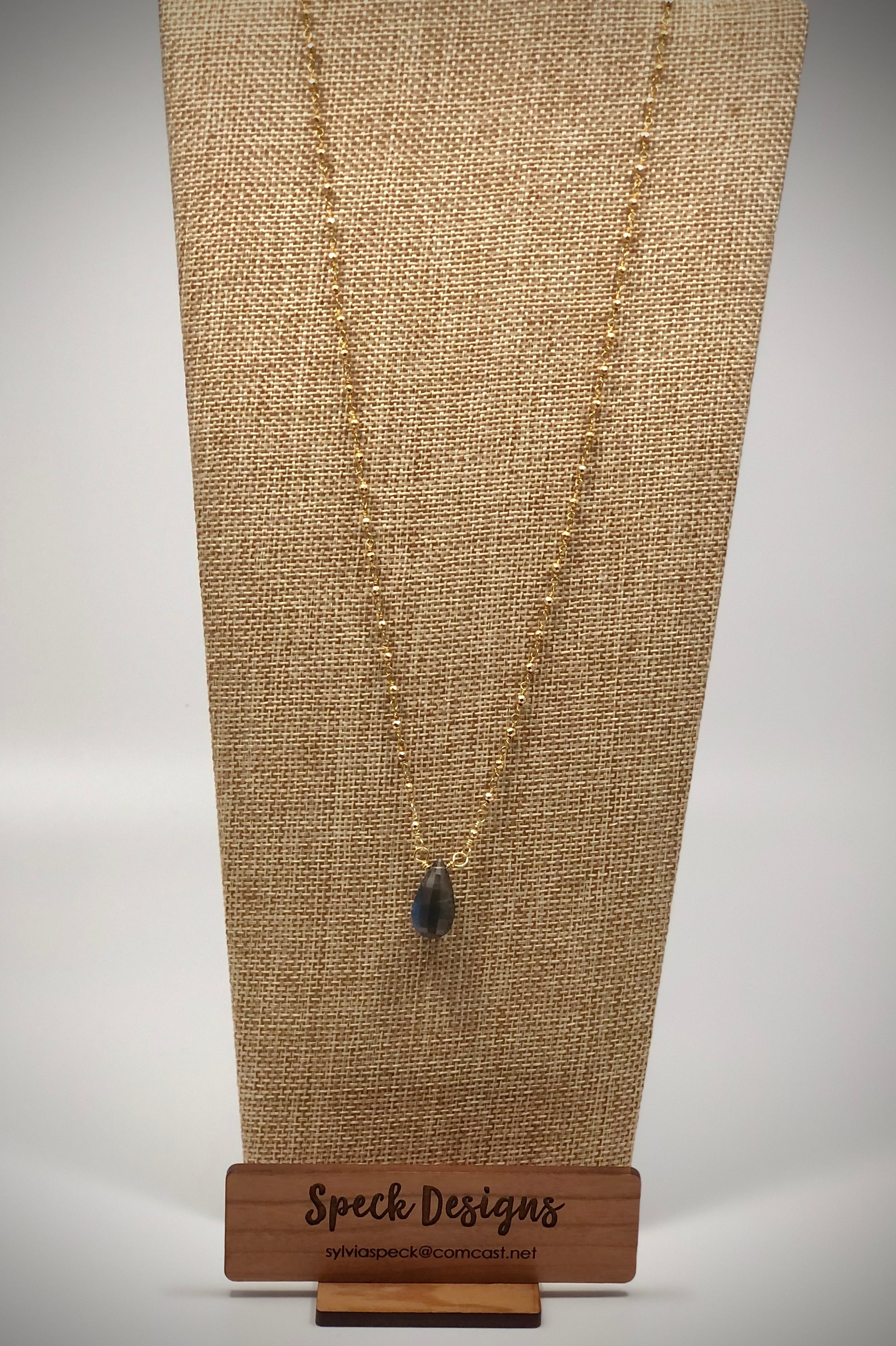 Beautiful tear shape labradorite stone with gold pyrite chain. Necklace is 20.5 inches. Clasp is gold filled.
